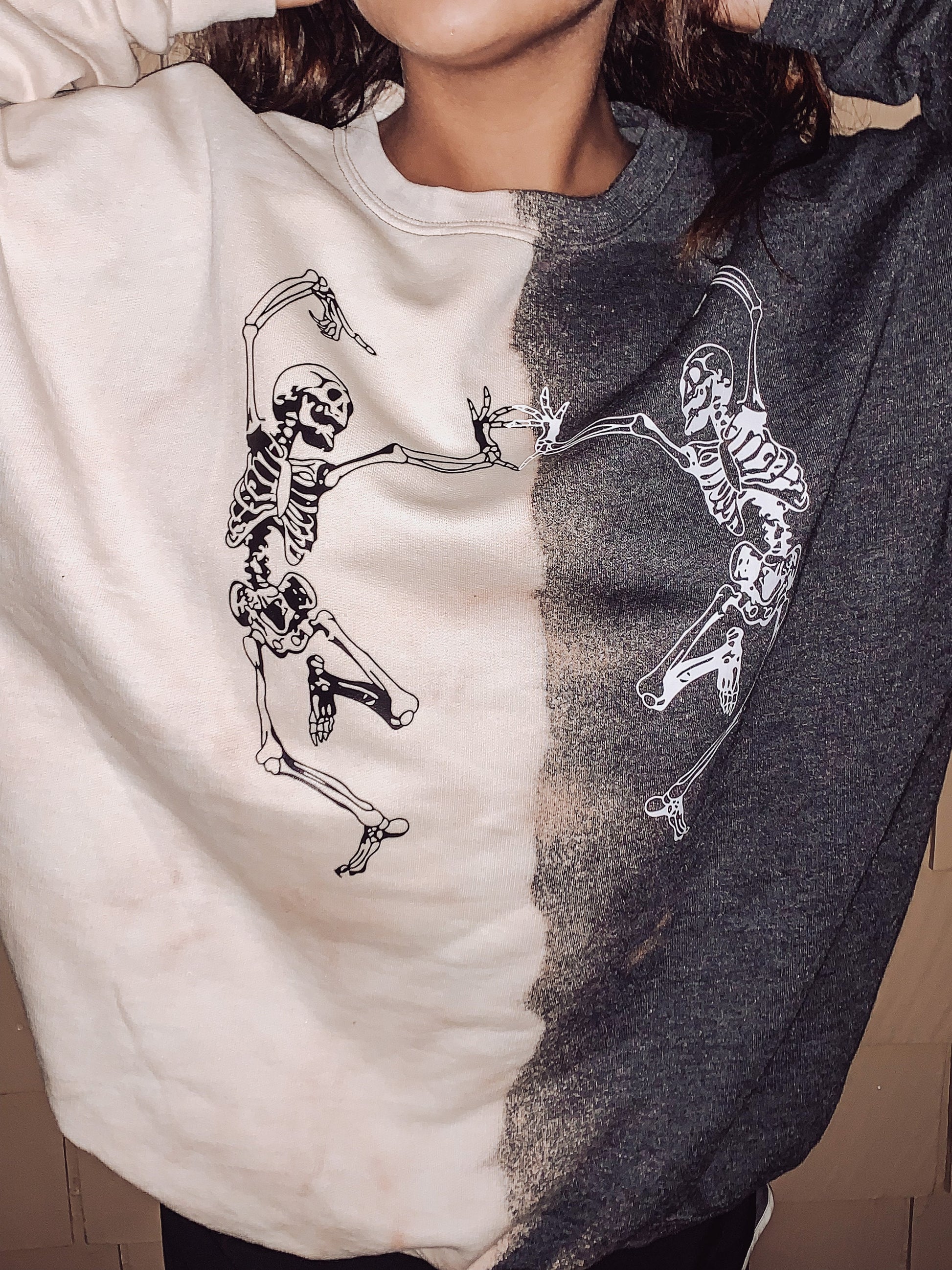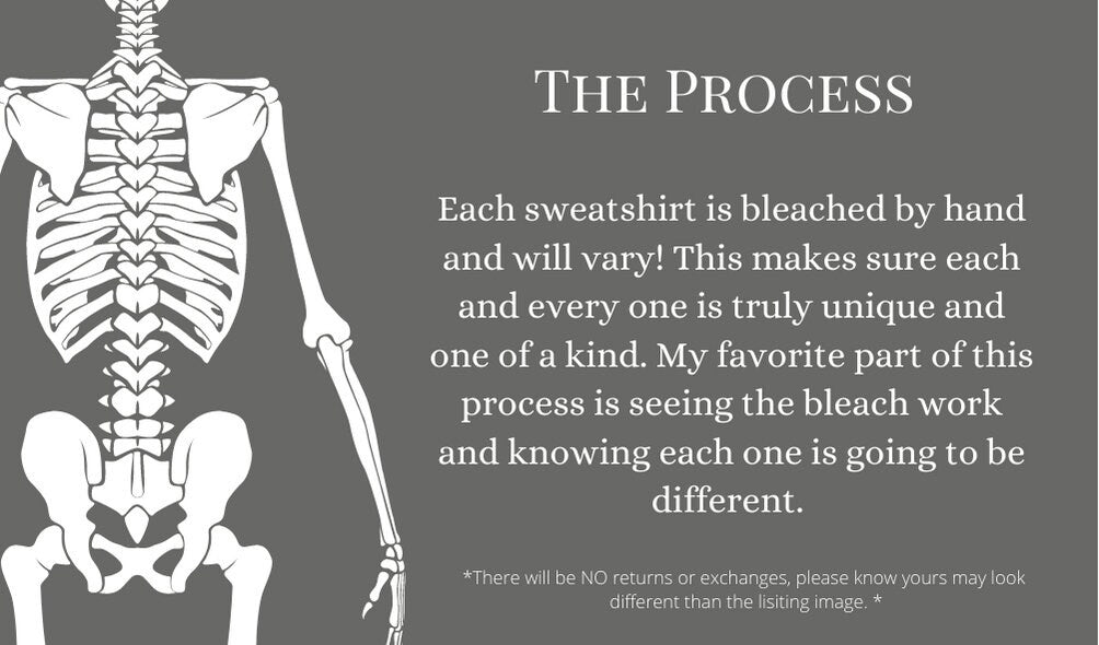 Each sweatshirt is bleached by hand and will vary! This makes sure each and every sweatshirt is truly unique and one of a kind! Sweatpants are drawstring waist and the opposite leg is bleached.